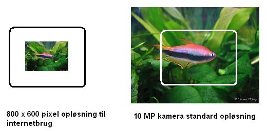 Til brug her på akvariesiden er 800 x 600 pixel rigeligt. Er er evt. tale om et billede, hvor man fx. ønsker at få en diagnose på sygdom eller lign. kan man gå lidt op i opløsning for at få flere detaljer med.