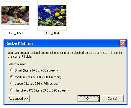 "Resize Pictures"-menuen er nem og overskuelig, vælg den ønskede opløsning (800 x 600 pixel) og tryk OK.