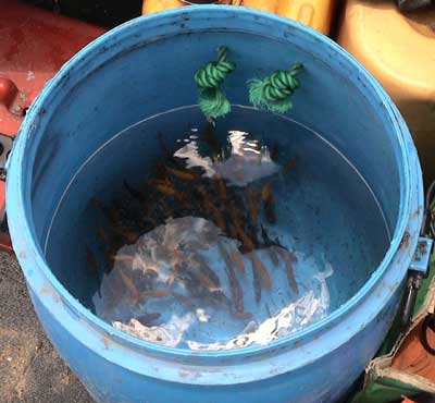 Når disse er i båden bliver der fjernet evt. døde fisk og de får skiftet vand. Der skiftes ca. 50 % vand under hele sejlturen. Vandet skiftes efter ca. 1-2 timer, enkelte tønder får, hvis de er presset med fisk, vandskift ca hver halve time.