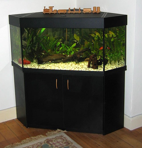 Gulvene giver sig lidt, så vi satte det 325 l Akvastabil stueakvarium helt op til væggen ind i et hjørne, men alligevel begyndte enden at synke en smule. For at undgå vand på gulvet (vi har tidligere haft fornøjelsen af et utæt akvarium) var løsningen at skifte til et hjørneakvarium.