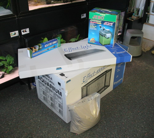 Da vi kom ind i Flyvefisken fortalte vi om projektet, og det blev rigtig godt modtaget. Faktisk sagde Flyvefisken at de ville sponsorere alt inventaret herunder spandpumpe, varmelegeme osv. Derfor vil jeg hermed særligt takke Flyvefisken.dk for at have støttet vores sag med deres flotte gave. Det betød nemlig at vi kom hjem med et 250L akvastabil effectline med effectlight armatur!