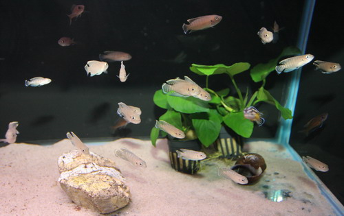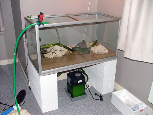 Så er akvariet dekoreret med sand, kalksten og lidt planter. Der er stor jubel blandt beboerne. Vi har dog valgt ikke at fotografere dem, da vi ikke ønsker at fremstille nogen som tvangsanbragte.