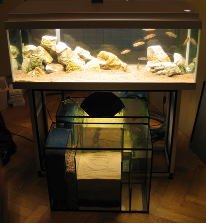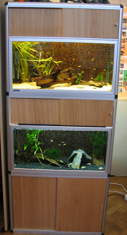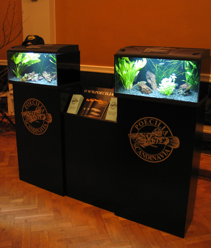 Poecilia Skandinavia (www.poecilia.org ) havde lavet et podie. Det kan ses på billedet at det består af 2 startersæt på 54L fra Eldorado, som er hævet op på et par standere. I mellem er der en bro hvor folderne ligger.