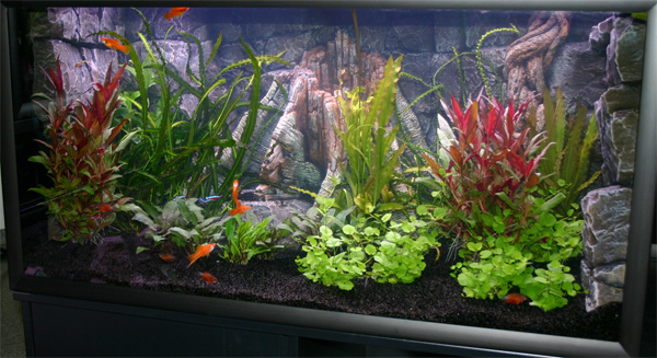 En reol med 180 l. + 128 l. + 85 l. med prydsfisk