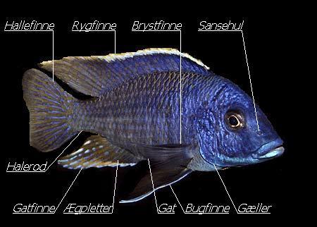 Hereunder vises et billede af Mylochromis epichorialis hvor vi ser betegnelserne for de forskellige dele på cichliden.