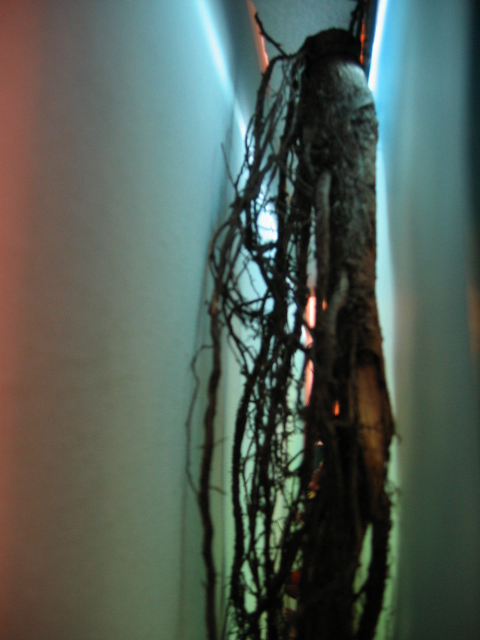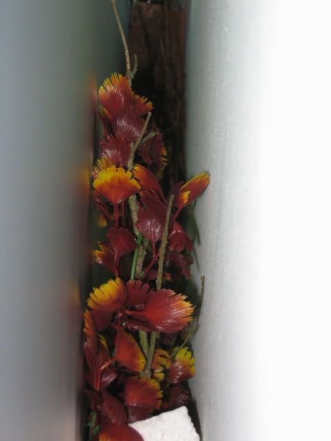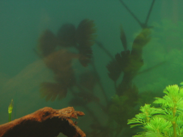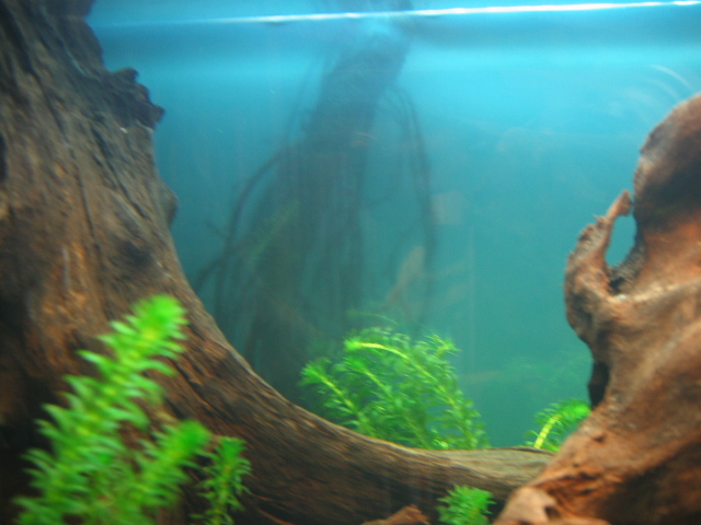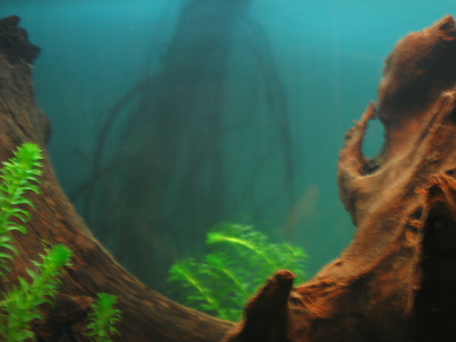 Rødderne jeg brugte var lige ved hånden da den sidste store storm lagde mit grantræ i haven ned, således at der kom en stor del af rodnettet til syne.Til at illudere bundplanter har jeg købt nogle af de "flotte" plastikplanter der fås i akvariehandelen nu om dage !!De blev så omviklet af tyndt ståltråd så de kan stå op uden vand, og placeret på den omtalte "dukketeaterslæde) nu kunne de forskellige rødder og planter sættes ind fra siden af, og BAG akvariet imellem den blå folie og den hvide væg...Og samtidig kunne denne baggrund belyses , hvis man ønskede det.