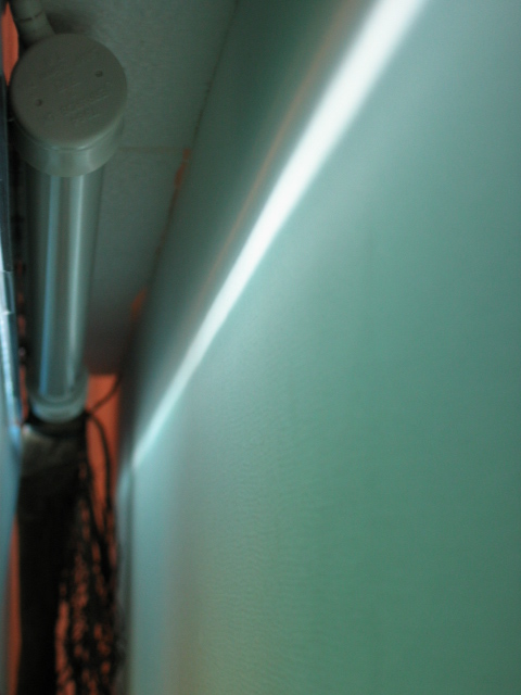Nu blev folien så sat fast bag på akvariet med den blå side ind mod glasset og med den nuppede afrivningsfolie væk fra glasset. Akvariet blev placeret 6 cm. fra væggen, da jeg syntes at det så forkert ud med 10 cm. Men det er helt sikkert at hvis men kan leve med en afstand på 10 cm. mellem akvariet og væggen ville det være noget lettere at få den helt rigtige dybdevirkning.Det er vigtig at væggen bag akvariet er helt hvid, således at "horisonten" fortoner sig bagude... Så blev der placeret et Sun-Warm daylight rør bag toprammen af akvariet således at røret og ledninger IKKE kunne ses fra akvarieforsiden..(Hvilket type rør men vil bruge er jo op til en selv, men jeg ville gerne efterligne solens varme farve...Amarturet blev placeret således at det sad lige i midten af akvariet. Over armaturet lavede jeg en dækplade af "flamingoplast" således at jeg kunne hænge diverse rødder op i denne. I bunden af baggrundskassen lavede jeg et "gulv" hvorpå diverse "slæder af "flamingoplast" kunne skubbes ind fra siden. Lige som i et dukketeater i ved ...