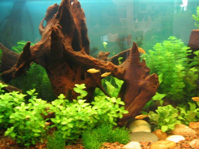 Jeg har selv sat mine rødder i mit "asiatiske" akvarium efter "det gyldne snit" således at det ikke "brækker over" på midten..Altså lidt flere rødder i en ene side og så med et sigte til baggrunden i mellem .Ligeledes er det vigtig at planterne i akvariet bliver sat rigtig. Helt små forrest, mellemstore i midten og dem der gror op til overfladen bagerst.. Men det er vel også sådant at de fleste indretter sig, ikke !