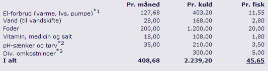 Af beregningen, kan du se at en enkelt fisk i rene produktionsomkostninger vil løbe op i knap 50 kroner. Hertil kommer så opdrætterens omkostninger for kørsel eller fragt (efter mad, medicin) og ikke mindst tidsforbrug. Gennem hele opdrætsperioden bruges typisk mellem 14-20 timer om måneden på et enkelt kuld, hvilket svarer til ca. 1½ time pr. individ gennem hele opdrætsperioden.