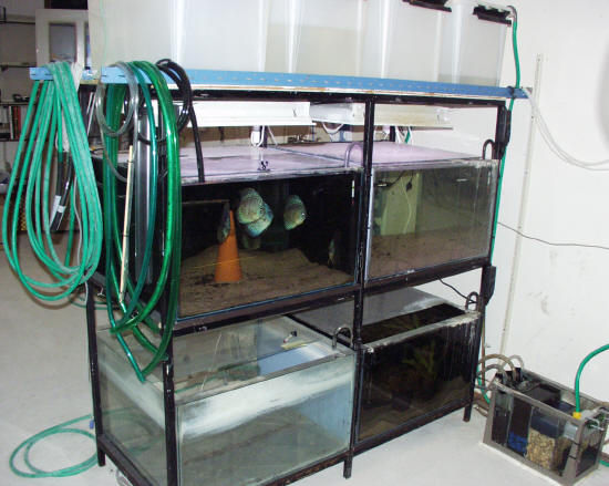 Billede: Foreløbig opsætning af reol med fire 200 liters akvarier. Bemærk centralfiltret nederst til højre på billedet. Foto: Kim Gam-Jensen