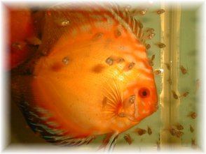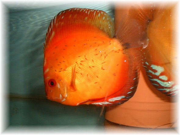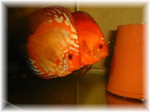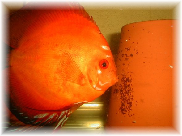 Beroende på vilken temperatur du har i dit lekkar eller akvarium, så kläcks äggen olika fort, men vid en temp av 28.5 grad kläcks äggen efter ca 55-60 timmar . Paret jobbar i skift och turas om att vifta med sina främre fenor, så att vattnet hela tiden cirkulerar runt äggen. De plockar även bort ägg som inte har befruktats samt möglat med sin mun. Efter cirka 3-4 dagars slingrande på krukan blir de fri- simmande på morgonen och börjar söka sig till sina föräldrar. Har man diskus med pidgeon-gener i sig , typ marlboro red som jag har på bilden, kan ynglen ha svårt att hitta sina föräldrar. Under länken artiklar kommer jag beskriva hur man kan hjälpa ynglen vid frisimmandet.