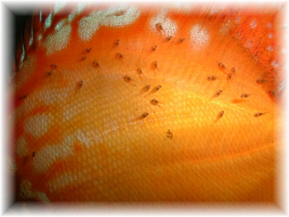 Här har mina yngel äntligen hittat sina föräldrar efter en dags letande. Man kan också para en röd turkos samt en pidgeon för att undvika detta problem. Om man tittar på en röd turkos färgsättning, före och efter lek, så kan man se att fiskarna blir mörka och näst intill svarta på sina fenor. Detta gör att ynglen hittar sina föräldrar mycket lättare till skillnad mot en marlboro, som är helt röd. En pidgeons arvsmassa är dominant gentemot en röd turkos. Därför får ynglen i huvudsak marlborons utseende.