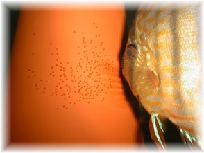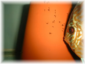 Har man tänkt att odla diskus tycker jag att man endast skall odla på fin fisk. Det är minst lika jobbigt att odla på en fin fisk som en defekt fisk. Det man skall titta på är att fisken inte har några defekter, som spruckna ögon, väl utvecklade fenor, rund och fin kroppsform, korta eller under utvecklade gäl lock, samt att fisken skall vara frisk. Om fisken inte är helt frisk när man sätter den i lek kan det skapa stora konsekvenser för ynglen och få något av det jag nämnt ovan. Ger man paret en bra miljö och en bra kost behöver man inte vara orolig, men parasiter, flagelater samt bakterier är inte alltid lätt att upptäcka. Har man upptäckt att fisken inte mår bra måste man först konstatera vad som orsakat detta och eventuellt medicinera paret. Medicinering är inget jag förespråkar och använder ytterst sällan, men ibland är det nödvändigt. En salt kur och förhöjd temperatur av vattnet är något som jag ibland gör innan jag sätter fisken i lek. Detta är en ganska harmlös kur men effektiv mot vissa bakterier samt flagelater. På bild 2 har mina röd turkos yngel kläcks.