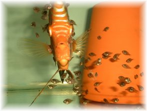 Ett problem, som jag råkade ut för var, när jag satte ett av mina blue diamond par i lek, var att jag fick väldig dålig kläckning på äggen. Jag kollade alla vatten värden men hittade inte orsaken till varför paret helt plötsligt inte hade den kläckningen på äggen som dom har haft förut. Jag provade att odla i princip nästan rent osmosvatten, men jag fick samma dåliga resultat. Jag började spekulera om min hanne hade gått och blivit steril och tänkte släppa in en ny hanne. Men i samma veva hittade jag en artikel om en ny startad odling i England, som hade samma problem fast på alla sina par. Orsaken för han var vattnet samt en för hög temperatur i lek karen. Efter att grubblat över detta problem ett tag gick jag ner i källaren och satte dit en extra termometer och till min förvåning visade denna 33 grader. Hannens spermier dör lätt i en sån här hög temp eller blir mindre piggare och därav får man en sämre kläckning. Den första kullen efter sänkningen var kläckningen lika dålig, men efter den var allt ok igen. Det verkar precis som dom måste tömma sig en gång och sedan börja producera nya spermier. Numera kollar jag tempen lite extra, samt använder en bättre doppvärmare av märket jäger, som har en bättre temperaturskala. På bilden har mina röd turkos yngel blivit fri- simmande och äter på sina föräldrar.