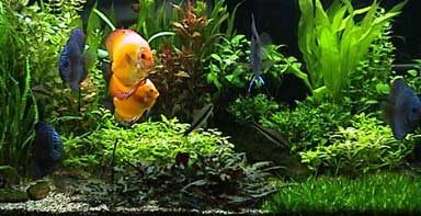 http://home.infinet.net/teban/jamie.htmInnredningFor å få en estetisk virkning kan akvariegrusen gjerne bygges opp slik at man har tykkere lag (10-15cm) bakerst i karet og ca 3 cm ved frontglasset. Det kan også være dekorativt å lage terasser som kan støttes opp med steiner eller annet egnet materiale. En liten rekke med steiner kan også være effektivt for å danne en grense mellom to plantegrupper slik at de ikke vokser sammen. En stor flat stein kan brukes til å lage et åpent område slik at akvariet ikke blir en sammenhengende plantemasse. Innredning av beplantet diskuskar skiller seg ikke så mye fra andre plantekar og dette kan du derfor lese mer om andre steder. Det er imidlertid viktig at karet har nok fritt svømmerom og at mengden av dekorasjoner og planter ikke overdrives. Når planteveksten først skyter fart, kan akvariet lett forvandles til en tett jungel. Jeg har opplevd at diskus har tullet seg inn i denne jungelen slik at de har hatt problemer med å komme seg ut igjen. Regelmessig luking er derfor nødvendig og noen ganger må man gå litt drastisk til verks.Kjemikalier Fy-Fy Det finnes mange preparater og kjemikalier som selges i akvariebutikken. Disse gjør ofte vondt verre og i et akvarium med mye planter skal man være ytterst forsiktig med bruk av slike midler. Hovedregelen er at man ikke skal bekjempe noen ting med preparater. Man må heller finne årsaken til problemene og gjøre noe med dem. Da først får man en varig løsning. Jeg har aldri brukt noen av de midlene som nevner her: