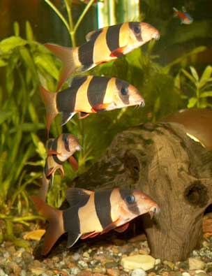 Praktbotia er en vakker og morsom fisk som dessuten har den fine egenskapen at den spiser snegler. Dette er også en stimfisk og man bør ha minst 4 eksemplarer for at de skal trives. Fiskene kan bli ganske store (ca 15 cm) og krever derfor at man har et forholdsvis stort kar som de kan boltre seg i. For praktbotia boltrer seg i ordet rette forstand. Svømmer i sirkler og er akvariet klovner. Det er derfor engelskmennene kaller dem Clown loach. De er mest aktive når lyset går av om kvelden og når det er mat å få. Jeg hadde en liten stim på 5 fisker i mitt akvarie. Det gikk bra en stund, men etter hvert som de ble husvarme ble de litt for glupske under foringen. De stresset diskusene og stjal maten fra dem. Til slutt orket jeg ikke se på dette lenger og fjernet botiaene fra karet. Bildet viser at de har fått et godt nytt hjem i naboens akvarie