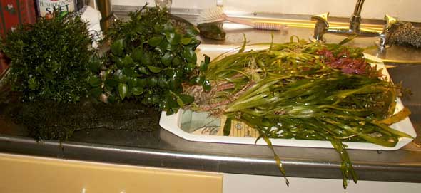 -Planter som vokser på stener og røtter tas ut av akvariet og klippes eller stusses hvis nødvendig. De kan også skylles litt i lunket vann (gjerne akvarievann) slik at slam og dritt fjernes.