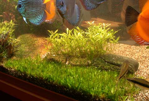 Her er et bilde fra en storlukedag. Gresspenen (E. quadricostatus) er nyklippet og alle plantene bakenfor (unntatt H. Polysperma) er tatt ut av karet. Grusen er omhyggelig slamsuget og det er klart for å sette plantene tilbake igjen. Her kan man også se en liten steinrekke som er nyttig for å holde plantegruppene skilt fra hverandre. Disse steinene er bare synlige når karet er nyluket.PlantenæringMan skal alltid være litt forsiktig med å tilsette plantenæring pga av fare for algevekst. For lite er bedre enn for mye. Spesielt i oppstarten er det viktig å være sparsommelig med plantenæringen. I et diskuskar blir det mye avfallstoffer. Disse blir bearbeidet av det biologiske filteret og en del av dette utnyttes av plantene. Med CO2-tilførsel får plantene et viktig grunnstoff (C=karbon) som brukes i fotosyntesen der sluttproduktet oksygen (O2) frigis til vannet. Derved få plantene en del av sine behov oppfylt uten at vi tilsetter noe som helst. Det viktigste sporelementet som vi bør tilsette er Jern (Fe) og enkelte hevder at det er alt man trenger å tilsette. Jeg bruker imidlertid Tropica Mastergrow som blant annet inneholder jern. Jeg kjørte lenge med halv dose av dette stoffet, men har etter hvert økt på litt. Så snart jeg ser antydning til alger reduserer jeg mengden igjen. Man finner også oppskrifter på nettet over hvordan man kan lage sin egen plantenæring, men dette har jeg ikke prøvd enda. Du kan for eksempel lese om Poor Man's Dosing Drops (PMDD) på følgende link: http://www.thekrib.com/Plants/Fertilizer/