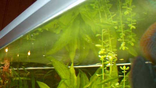 I nystartede kar hender det at man får en skjemmende fetthinne i overflaten. Denne blir man som regel kvitt ved å lage litt bevegelse i overflaten, for eksempel ved å sette vannutløpsrøret over vannflaten slik at vannstrålene bryter overflaten. I et plantekar bør man imidlertid unngå stor bevegelse i overflaten. Hvis man lar vannstråler eller luftbobler fra et luftdrevet filter (eller fra en luftestein) bryte overflaten vil dette drive CO2 ut av vannet. I et innkjørt kar med mye planter vil det sjelden være noe problem med overflatehinne. Bildet under viser imidlertid en grønn hinne som plutselig har dukket opp i karet mitt. Alle vannverdier er normale og jeg skjønner ikke helt hvorfor dette grønne belegget kommer. Jeg har fjernet den mekanisk flere ganger ved å suge den opp med papir, men den kommer tilbake.