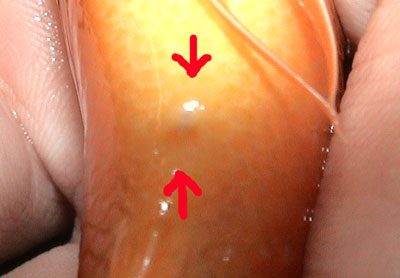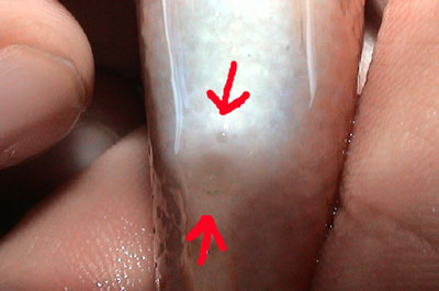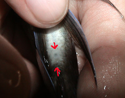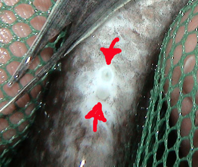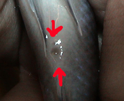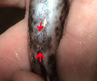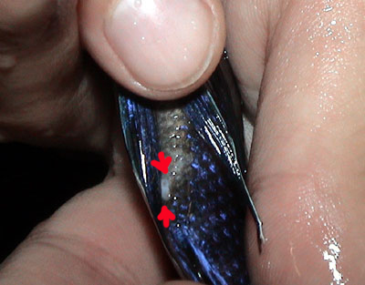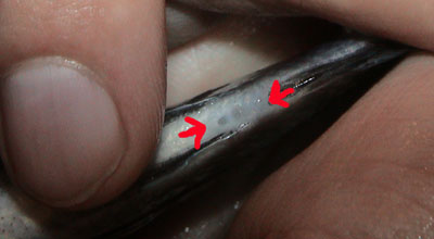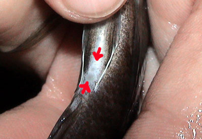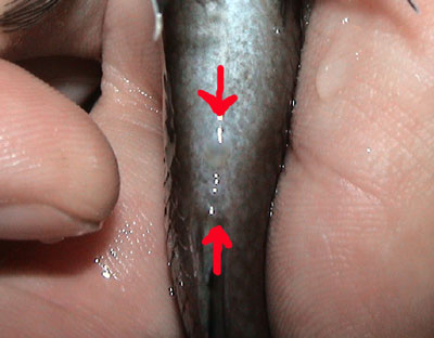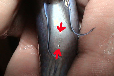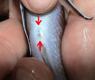 Det man skal se efter er de to "huller" lige foran fiskens gatfinne.