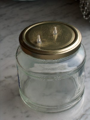 Fisk klarer hovedet, så jeg købte et glas sild og spiste dem. Og POP, så kom ideen: Hen til opvasken for at rengøre sildeglasset med metallåget. Herefter borer jeg så to huller i låget og limer et par samleled(Akvariewest til 5,- kr.stk) til luftslanger fast i låget med Araldit(Puds låg og samleled med sandpapir ved limestedet). Låget skrues godt fast og vips, så har vi en lyddæmper.....den ene tilslutning sættes til luftpumpen med en kort slange og den anden går til luftstenen i akvariet. Al brummelyd er nu pist væk !