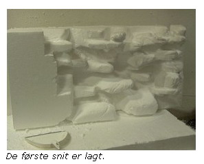 Gør dig klart hvilken stil du vil arbejde i og begynd så at skære ud med hobby-kniven. Brænd lidt med varmeblæseren og brug stålbørsten til at lave "spor" og revner i klipperne. Slib efter med sandpapir.
