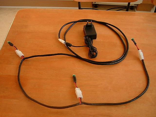 jeg klippede stikket af tranformeren, og monterede et multistik, der efter loddede ledning på pærene og monterede også multistik på dem. Jeg lavede et ledningsnet, til natbelysningen der er parallelforbundet.