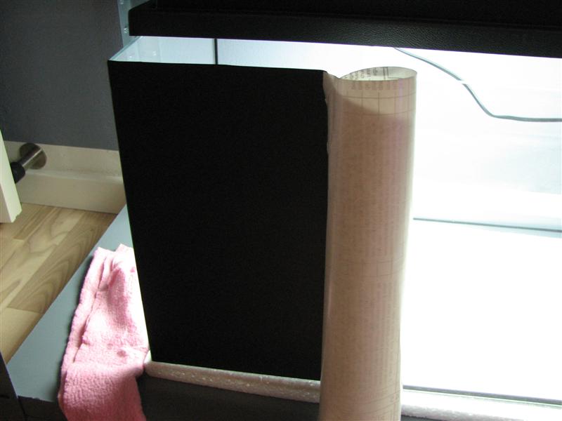 Nu skulle jeg ind og sætte det på akvariet, og det var egentlig også ganske let, for der er en selvklæbende side på hyldepapiret, og det er bare den som skal sættes på glasset. Nu skulle jeg bruge kluden til at påføre folien, det er nemlig på mystisk vis bedre at gøre det med en fugtig klud, end at gøre det med de bare næver. (se billeder)