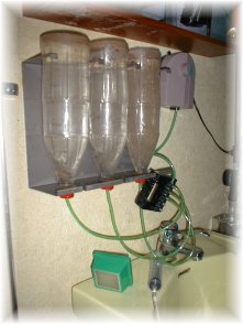 Genom att skära av botten på en 1.5 liters coca-cola flaska samt cilicona fast en slang i kork änden har jag fått en artemia kläckare.Flaskorna har jag sedan hängt upp i en liten rostfri ställning som jag skurit ut i lasern på jobbet.Den är tillverkad så att man lätt kan plocka ut flaskorna samt göra rent dem om så behöves.Till flaskorna har jag sedan kopplat till en pump som orkar driva dom samtidigt.Mellan pumpen och flaskorna har jag satt dit en luftfördelare som förser varje flaska med luft.Jag brukar blanda i en och en halv tesked med artemia samt 3 msk=(15-30 Gram/liter) med havssalt.Man kan också använda vanligt jodfritt salt men då får man inte med fina mineralerna som ett havs salt innehåller.Jag brukar även droppa i några droppar vattenlösliga vita miner i vattnet.Varje liten artemia blir då som en liten energi bomb och hjälper ynglen att få en bra start i livet