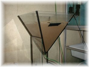 Efter hand som ynglen växer ökar jag kläckandet av artemia .När sedan cola flaskorna inte räcker till startar jag min stora kläckare som kan innehålla 9 liter vatten (se bild 2).Beroende på vilken sorts artemia man använder kläcks äggen olika snabbt.Men i regel brukar det ligga mellan 24-36 timmar.I många böcker står det, att det är mycket viktigt att få bort de över givna ägg skalen innan man matar ynglen,annars kan dom få förstoppning och dö.Detta verkar över drivet och jag har inte haft några större döds fall om jag slarvat med detta.Men det finns ett knep man kan använda för att få bort mer parten av det .Använd först den större halten av salt som de rekommenderar på burken när du sätter flaskan för kläckning,Detta för att ägg skalen flyter lättare i ett saltare vatten.Efter att stängt av till luften fyller jag på flaskan så att det nätt och jämnt rinner över.När sedan artemian sjunkit till botten plockar jag ut flaskan och håller den över handfatet och trycker till på den så att skalen rinner över kanten.Nu har man en flaska nästan med enbart artemia.Sedan tappar jag av artemian via till lufts slangen och sköljer dem i ett finmaskigt nät.Den lilla gröna burken på bild1 är artemia silen.