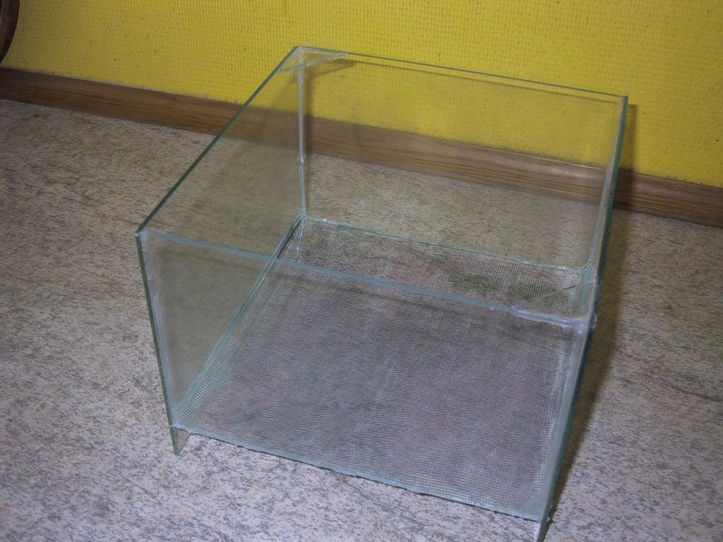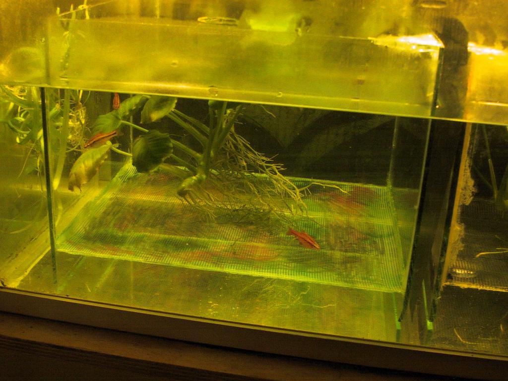 En anden metode er at lægge et fintmasket net over bunden og holde det nede med f. eks. småsten. Sådan udviklede ideen til denne æggerist sig. Problemet var, at f. eks. zebrafisk fik presset sig ind under nettet, så det hele måtte laves om. Efter en del eksperimenteren limede jeg i princippet et akvarium, hvor bunden i stedet for glas udgøres af et fintmasket net som på dette billede: