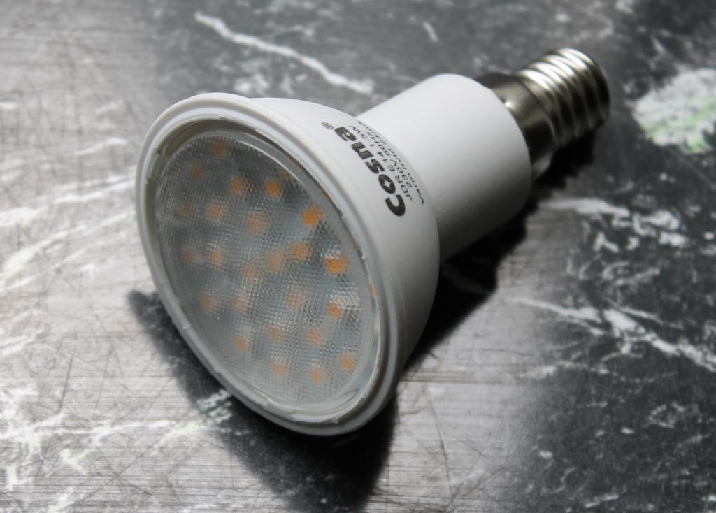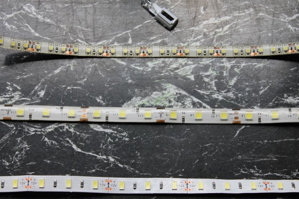 Her er det fra oven en LED-pære, en stump vandfast 3528-bånd, vandfast 5050-bånd og en ikke-vandfast stump 5630.