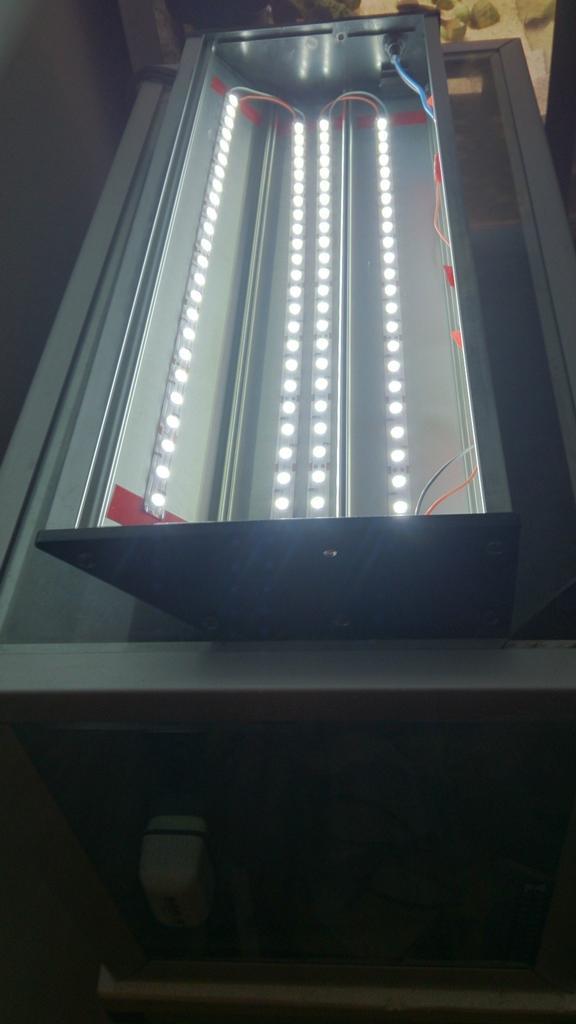 Her er et nydeligt eksempel på en hjemmebygget lampe til et 60-liters akvarie bygget af Søren Nielsen med 4 stk. 5050-bånd monteret: