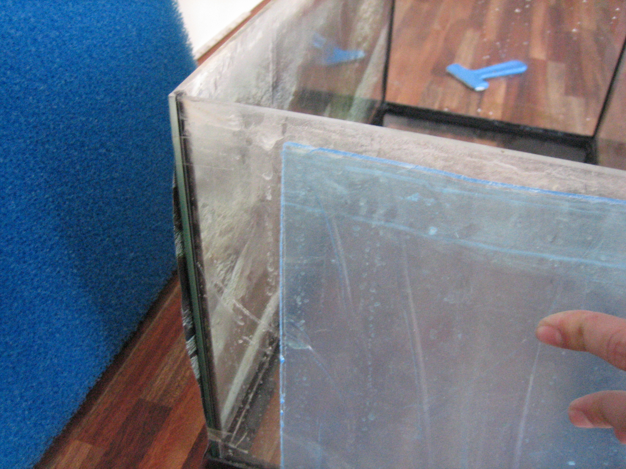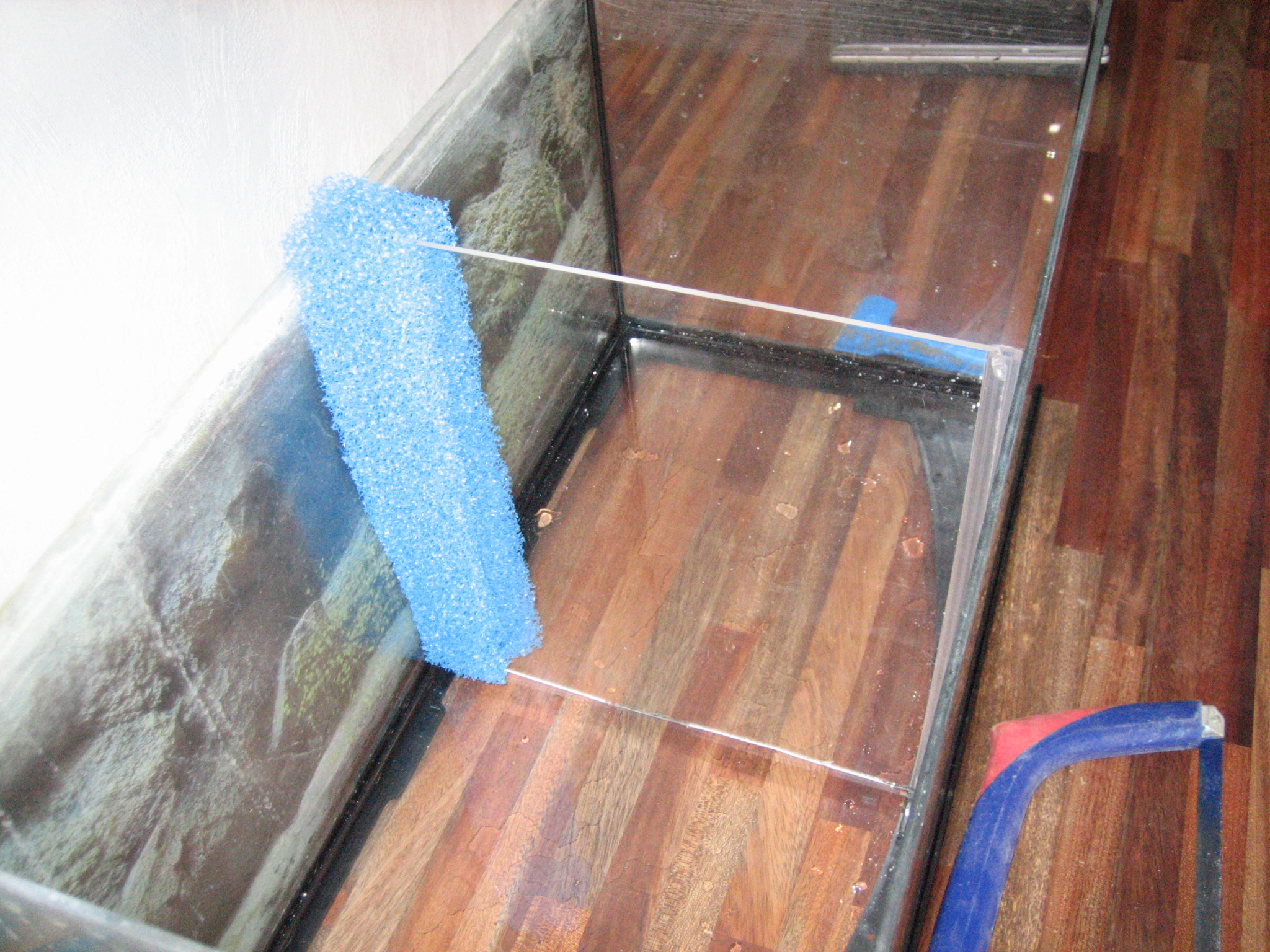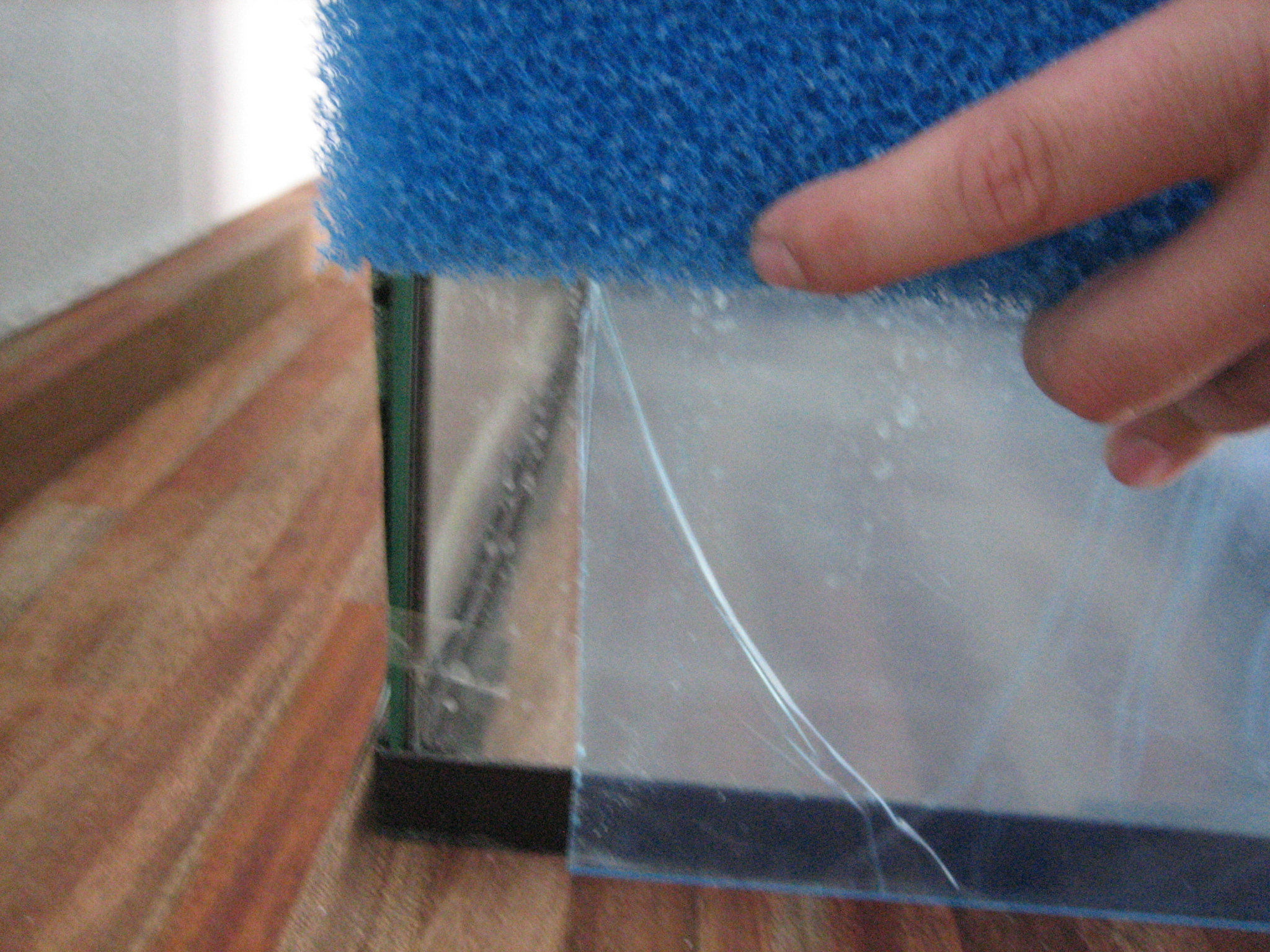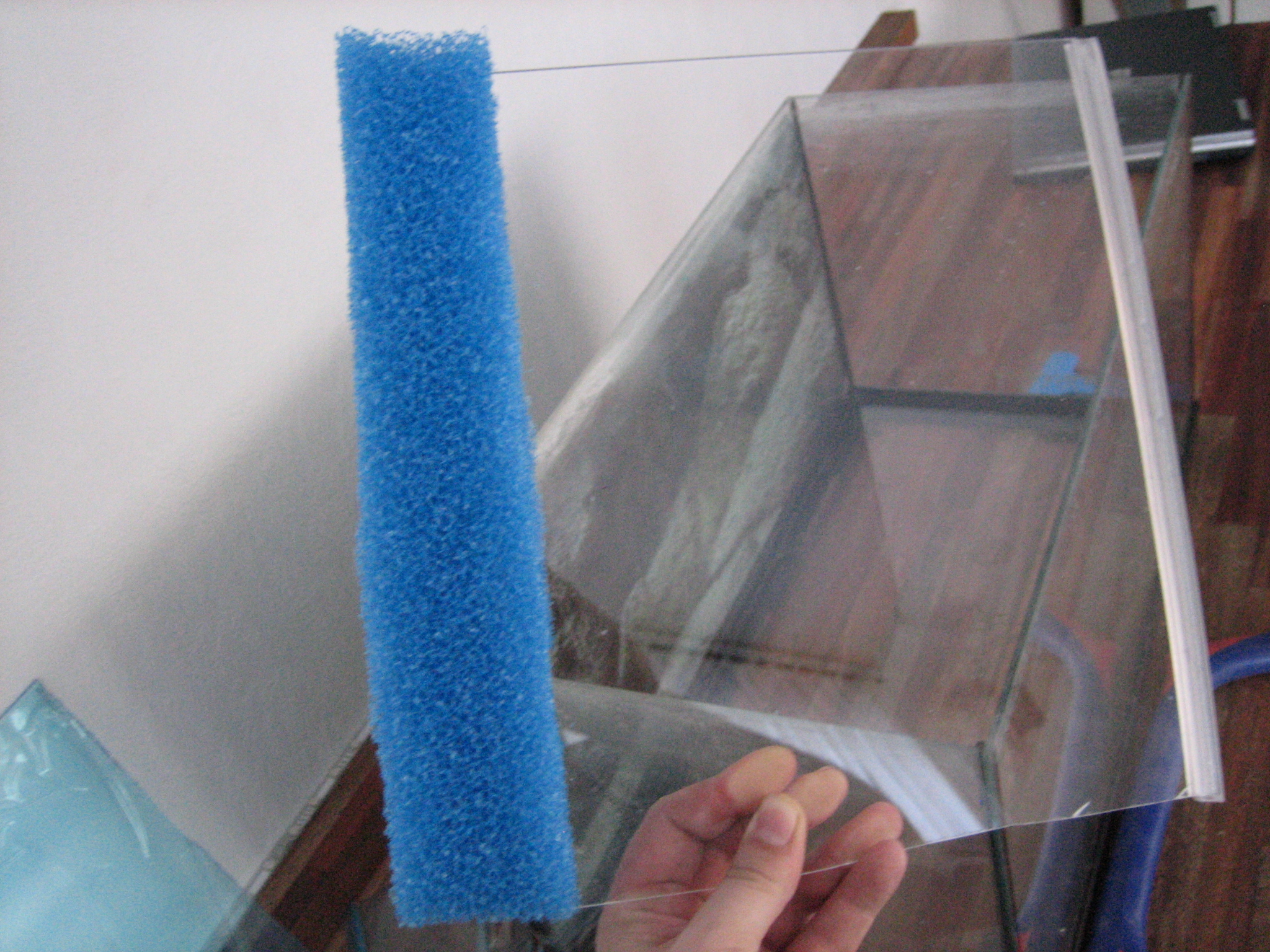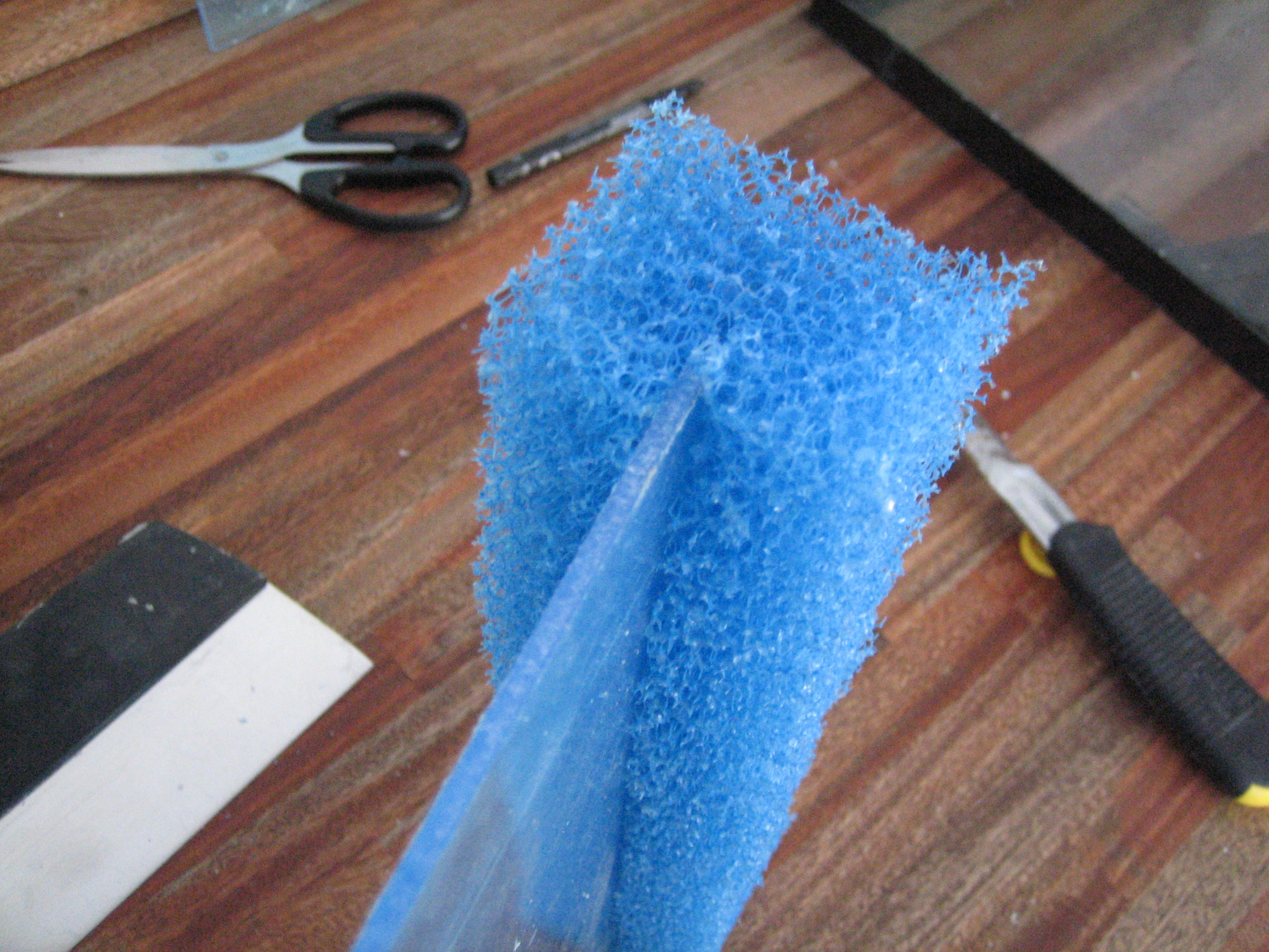 Du starter med at mærke plexiglasset op, så det er en del kortere end akvariet er dybt, hvor meget kortere bedømmer du selv, alt efter hvor grov en filtersvamp du har valgt at benytte. Stykket skal ikke være større, end at svampen kan sidde i spænd uden at bøje.