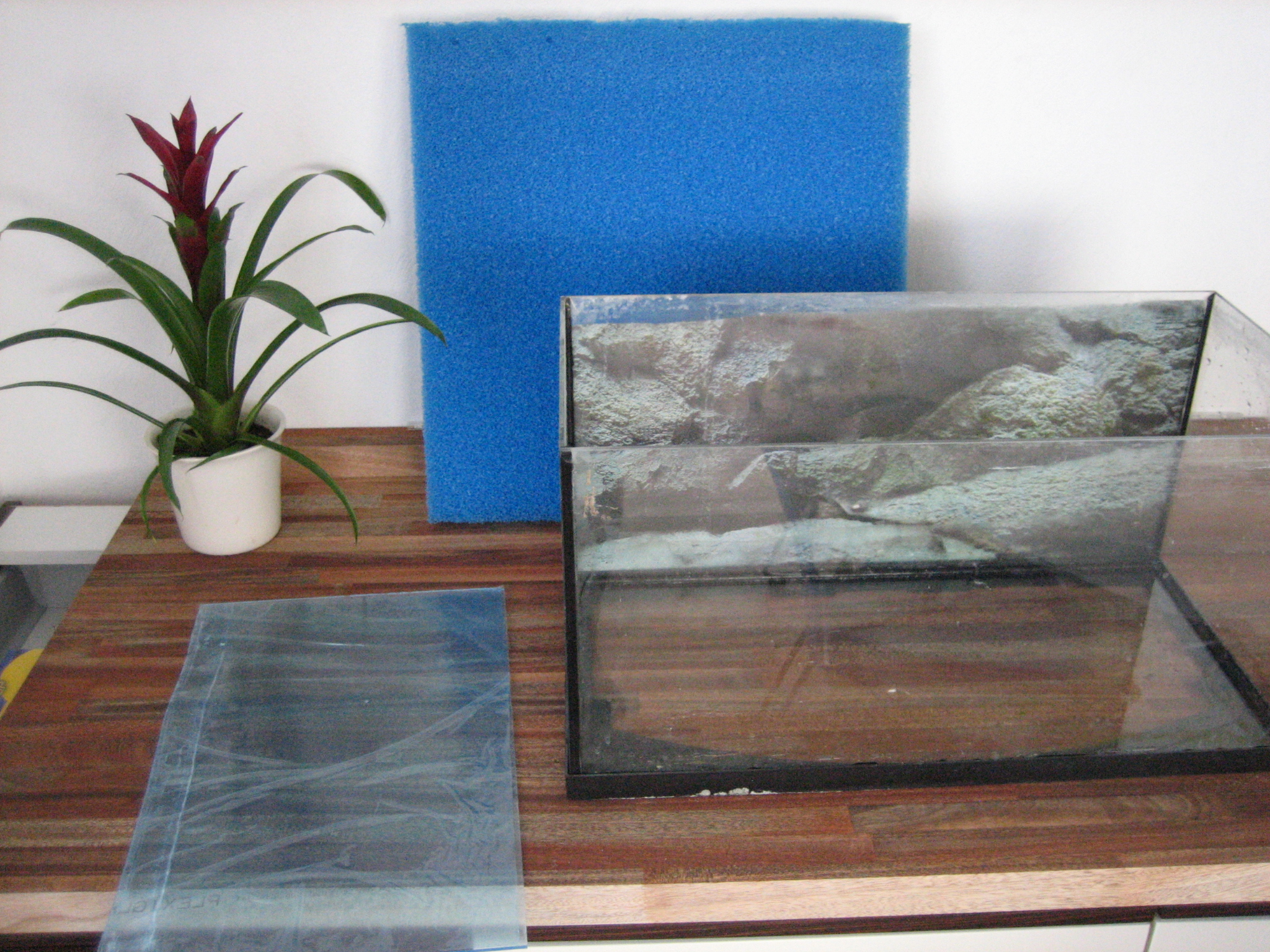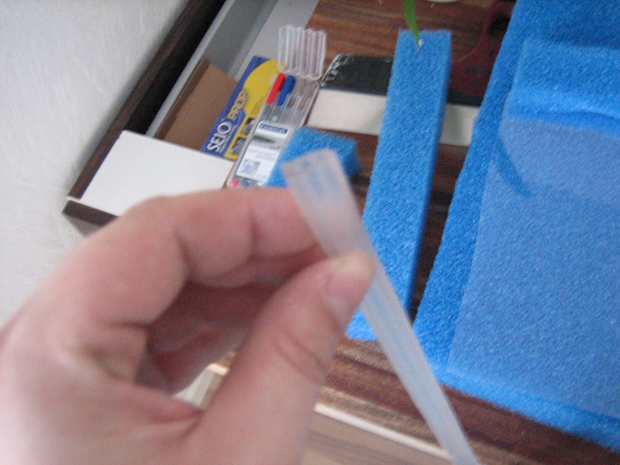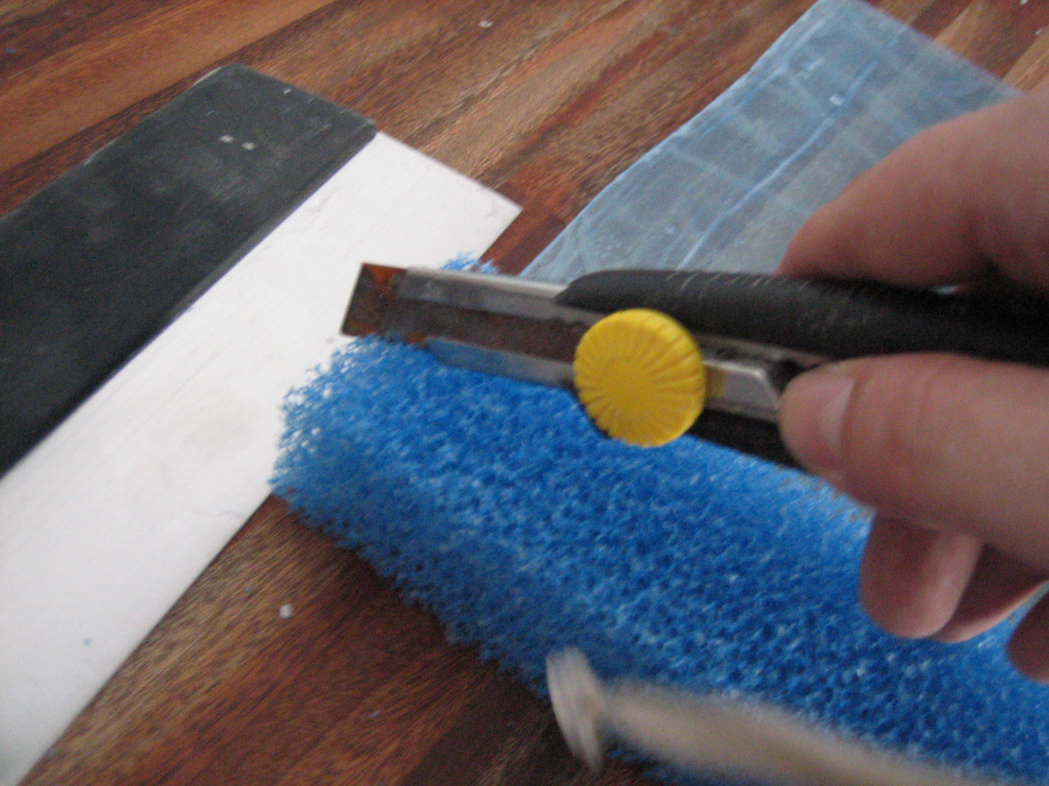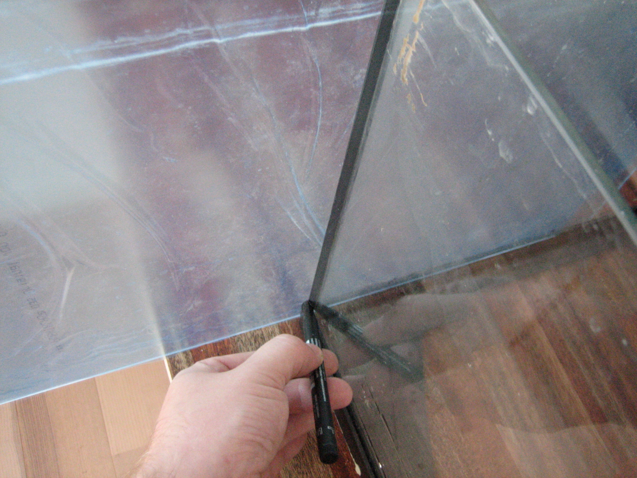 Du starter med at mærke plexiglasset op, så det er en del kortere end akvariet er dybt, hvor meget kortere bedømmer du selv, alt efter hvor grov en filtersvamp du har valgt at benytte. Stykket skal ikke være større, end at svampen kan sidde i spænd uden at bøje.