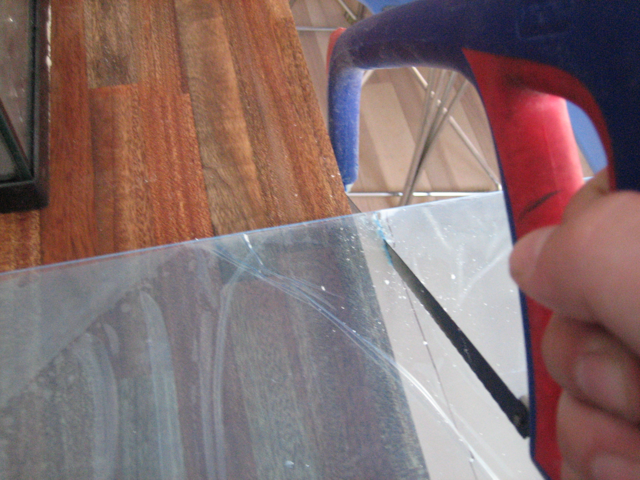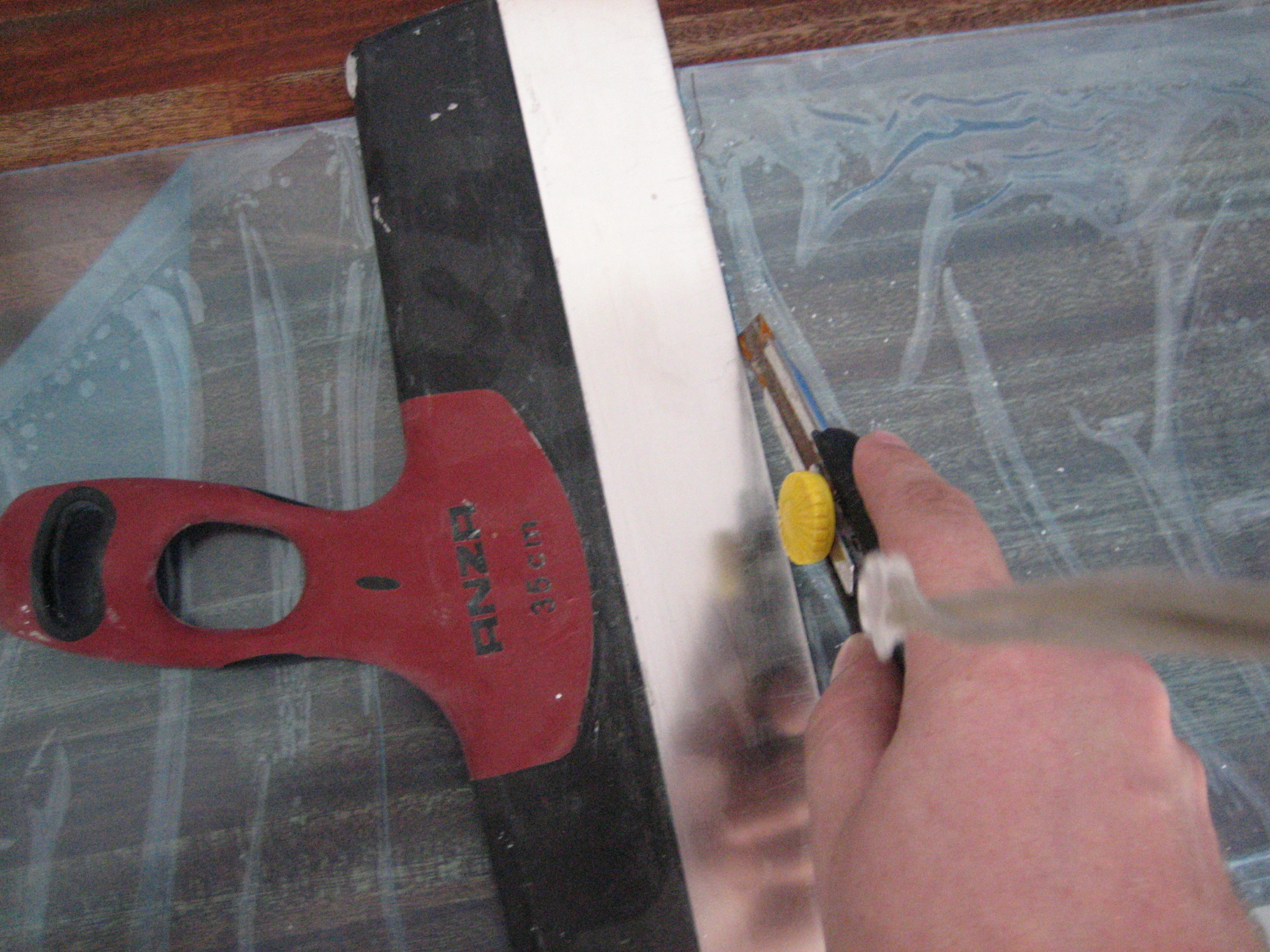 Så skal glasset skæres. Det kan gøres som her med en nedstryger, men helt klart det letteste og pæneste med en vinkelsliber hvis man har en sådan (Jeg kunne ikke lige finde min).