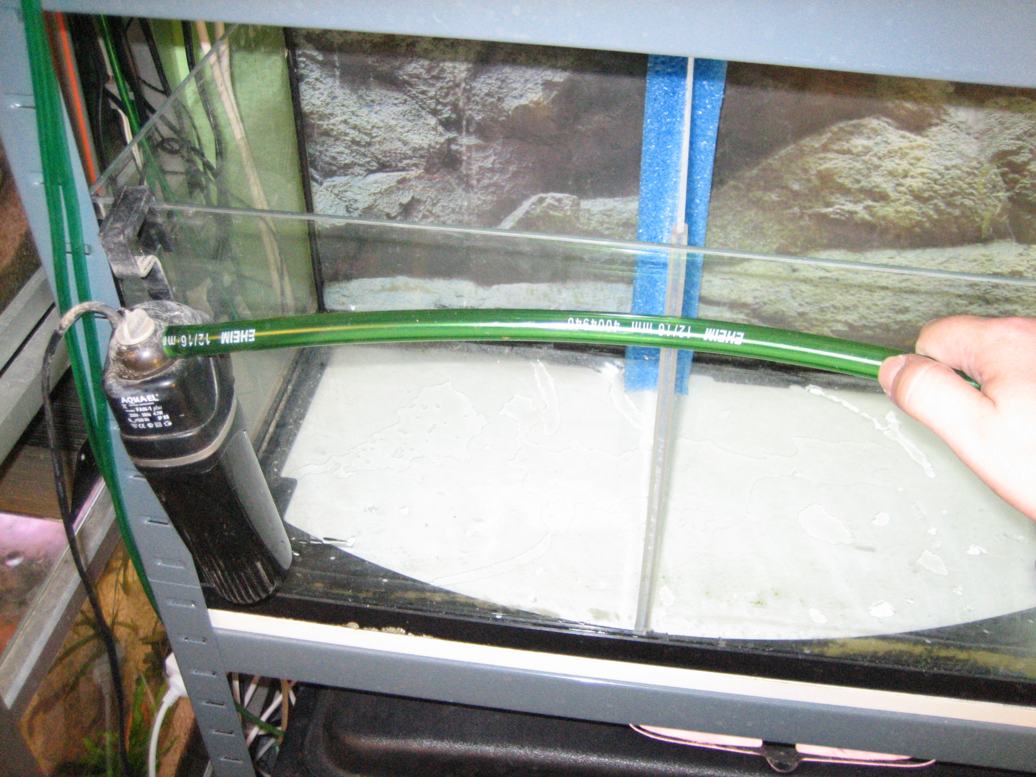 Da jeg har valgt at benytte et indvendigt filter, skal vi lige have lavet, så vandet cirkulerer på begge sider af pladen. Dette gøres ved at montere en slange på studsen til filteret og klippe den af, så den kan nå hen over glasset. Hvis du har et udvendigt filter, skal du bare sørge for at udsug og indstrøm er på hver sin side af glasset.