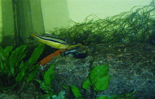 Jeg havde en gang et par Melanochromis auratus. Sælgeren der er en yderst kyndig og seriøs mand havde garanteret at de var han og hun, men som der står i den gamle revyvise ”det er ikke til at se det, hvis man ikke lige ved det”. Fiskene var et smukt par, de så ud som om de var af hunkøn, måske endda tvillinger. De var så fredelige som sådan nogle er. Selskabet bestod af andre mbuna i et 325 liter akvarie med masser af stenopbygning.