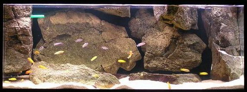 Man kan på nettet læse om alle mulige måder at lave baggrunde på. Det er sikkert meget sjovt men hvis det er besparelsen man går efter, så skal man vist ikke regne timeløn ud. Jeg enten køber baggrundsmoduler eller også laver jeg ”naturlige” baggrunde. Fx stabler jeg en masse sten eller rødder op som baggrund. Det er alligevel det man prøver at efterligne. Rødder bruger jeg dog ikke i mit Malawi akvarium. Rødder mv. gør vandet surt, og vi skal netop bruge det modsatte, nemlig en pH på over 7. Derfor er kalksten gode. De kan også købes/bestilles hos akvarieforhandlere.
