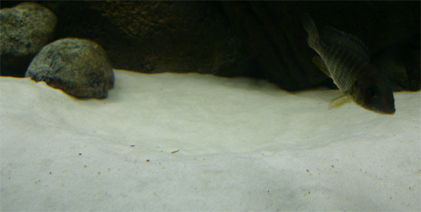 Hannerne bygger en rede i sandet på 1 - 3 meter i diameter, med kun 1 meter over til næste rede. Her lokkes hunnen hen og legen finder sted. I akvariet kan den finde på at bygge halvrunde reder op af feks. en sten eller en baggrund. Der er vist sådan en rede her på billedet. Når at ungerne bliver klækket efter at hunnen har haft dem i munden i ca. 21 dage, er man slet ikke i tvivl om at det er Taeniolethrinops furcicauda unger. De har så snart at de er blevet klækket hunnens farve.
