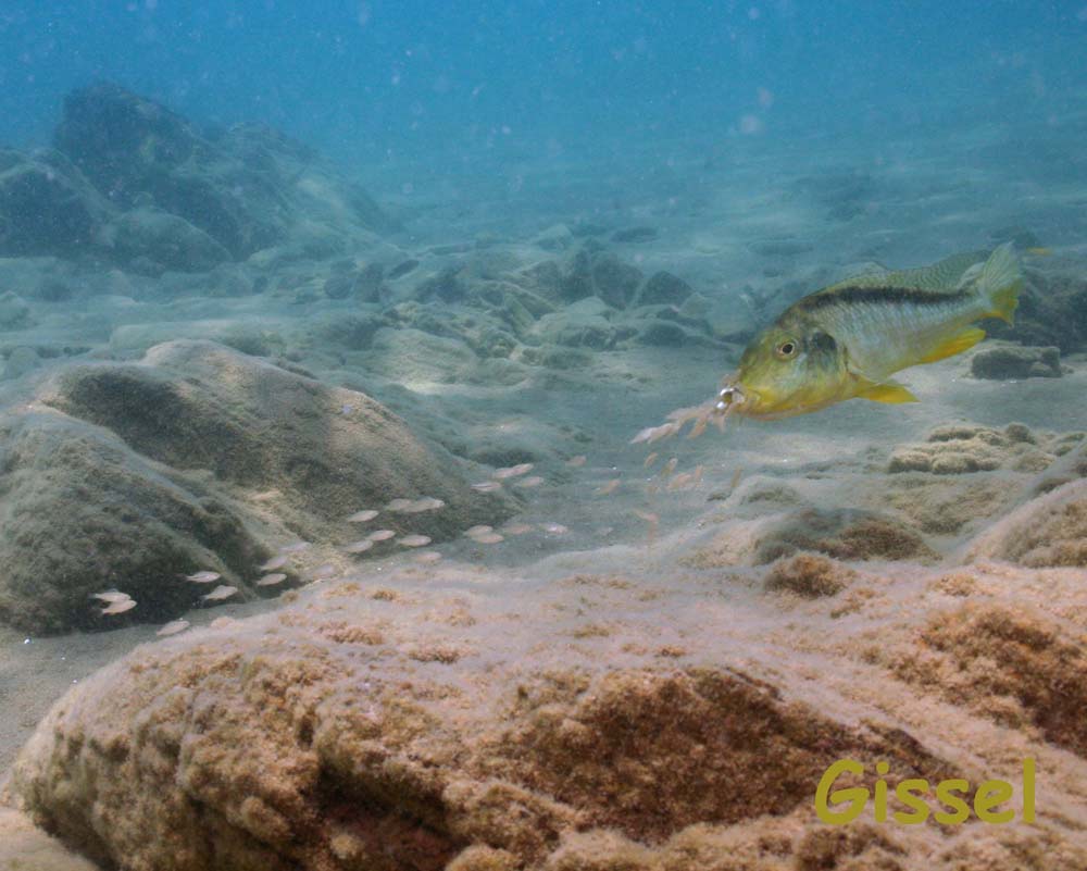 Taeniolethrinops furcicauda søger efter føde i sandet