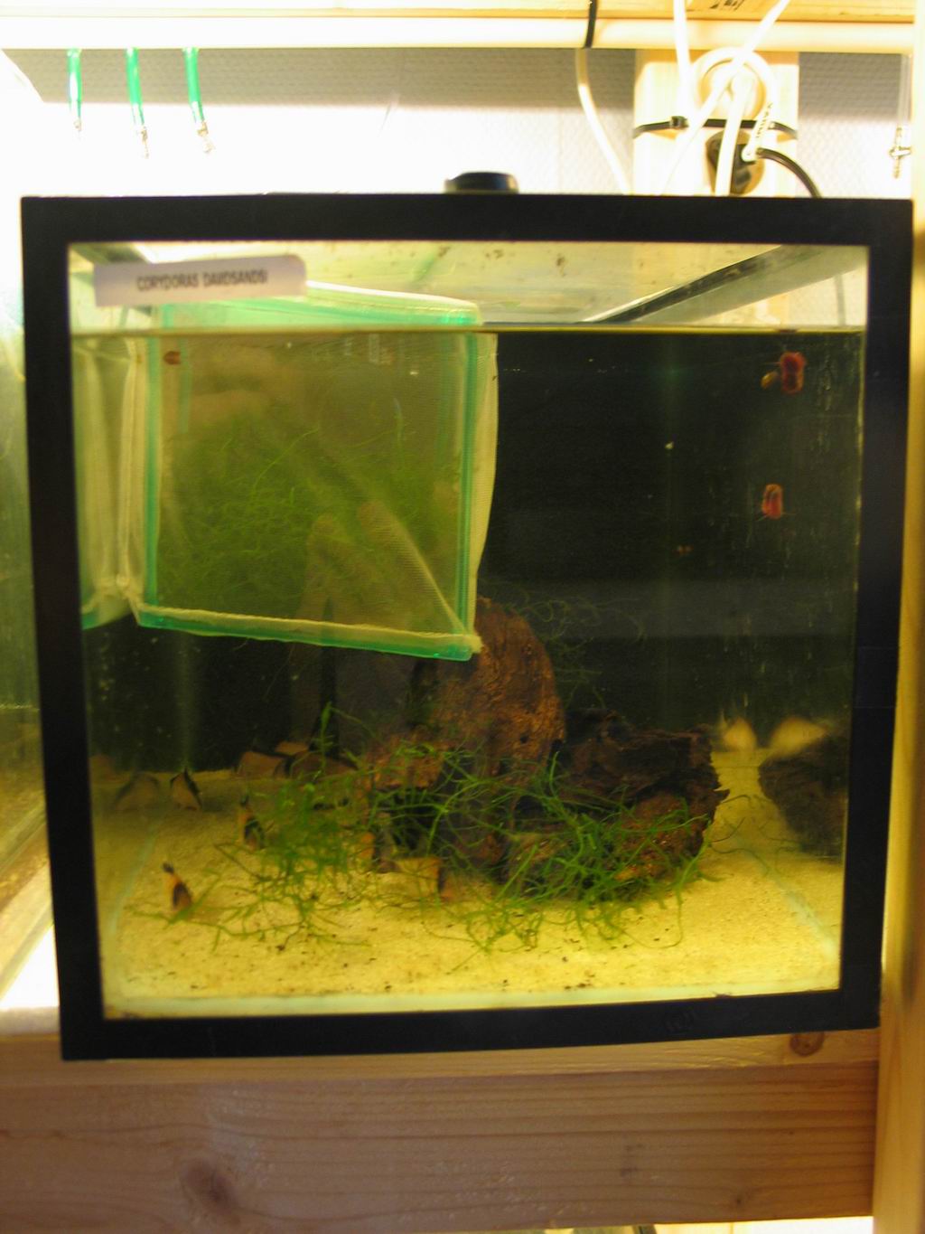 Her ses en "Net-Breeder" i brug; det er et netbur som er spændt ud af en plastic-ramme. Perfekt til at klægge æg i. Desuden sparer man besværet med at skifte vand i klækkebakker.