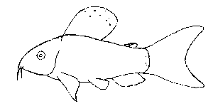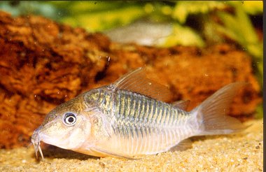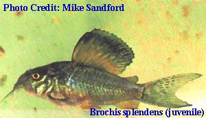 Billedet viser en ungfisk. Forvandlingen fra ung til voksen hos Brochis splendens er dramatisk.