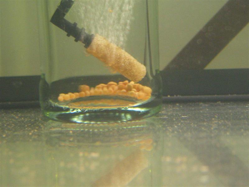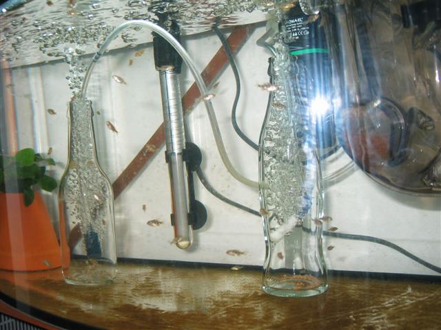 Er der mange ubefrugtede æg (det kan være svært at se, men de skal fjernes) så sæt flasken så den lige stikker op over vandoverfladen, så er det nemt at skifte flaske/vand og du får ikke svamp i hele akvariet.