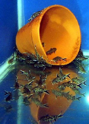 De unge fisk trives bedst i grupper, og sammen tør de bedre svømme ud i det åbne område og tage føde. Jeg kunne se at de akvarier uanset størrelse eller filter, at hvor der var store flokke af dem, jo hurtigere voksede de. Lav en masse skjulesteder i akvariet så de føler sig trygge. De første par måneder fik de afskallet artemia, og senere fik de Tetra mallepiller og min egen blanding af flagefoder som er mixet med spinat og holdt sammen med gelatine.