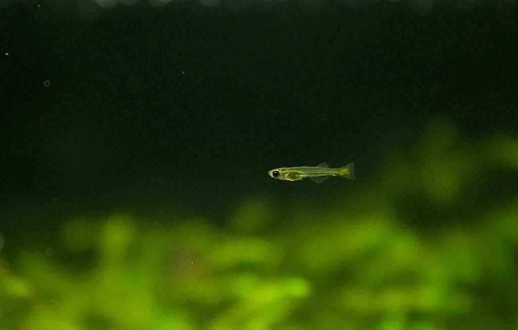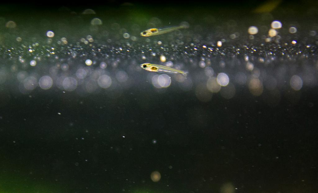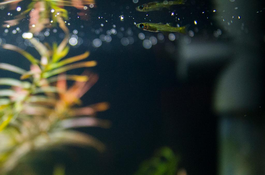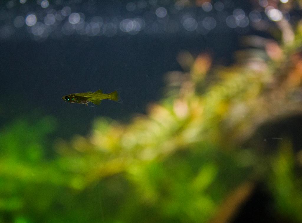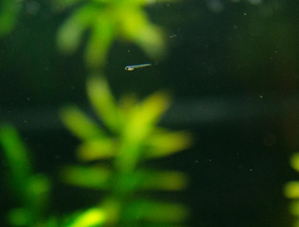 Dog undrer jeg mig meget over, at disse hår ser ud til at flyde mod strømmen i akvariet. Til min store overraskelse har de øjne, og det går endelig op for mig, at der er tale om nok det mindste yngel af fisk, jeg nogensinde har set. De er ca. 2 mm lange og ja, tynde som et kattehår.
