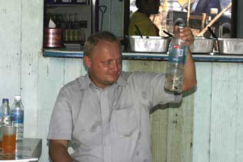 Billedtekst: Jesper Thorup brugte en ferie i Thailand i sommers til at fange fisk i. Her beundrer han en selvfanget kampfisk.