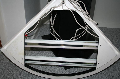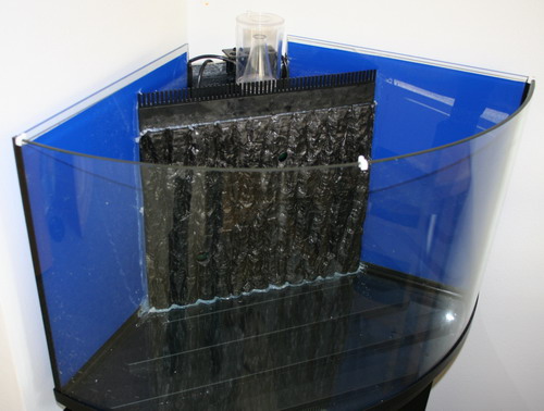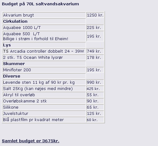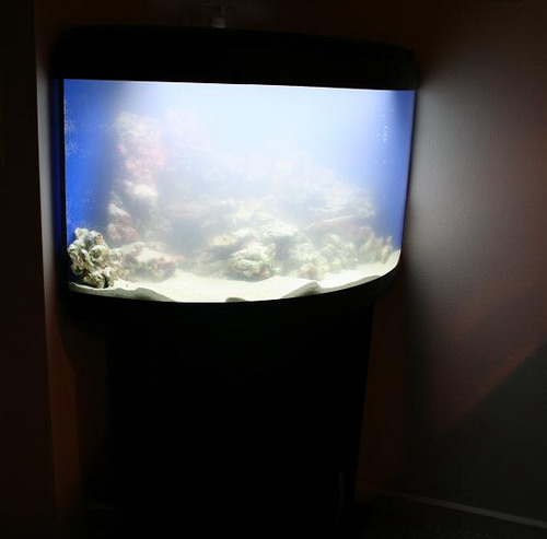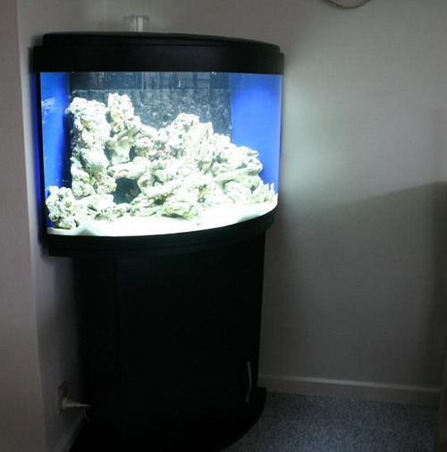 Her er et 70L hjørne akvarium som skal bygges om til saltvand. Det bliver med indvendigt overløb, minifloter skummer, 2 aquabee cirkulations pumper på henholdsvis 1000 L/T og 500 L/T og det er så rundregnet 21 gange i timen, som skulle være nok. Så skal armaturet bygges om til 2 x 24w T5, for der sidder kun 1 x 15w T8 i, og det er slet ikke optimalt for saltvand.
