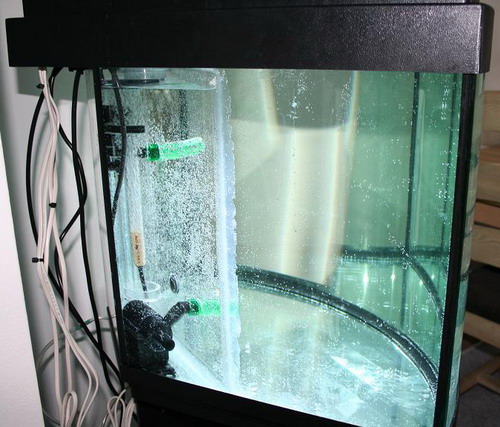 Her tester jeg så akvariet og teknikken for anden gang med vand i. Det er for at se om alt er som det skal være. Det var det ikke første gang! Her havde jeg lavet overløbet for højt, (tanke torsk) og derfor piblede noget af vandet ud når man slukkede for systemet. Jeg lavede det om og fik så begge pumper til at sidde inde i overløbet så al teknikken bliver skjult.