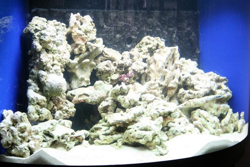 Her ses det så lige efter at jeg har kommet 11 kg levende sten i akvariet. Bundlaget er kommet i til sidst, derfor alt det grums.